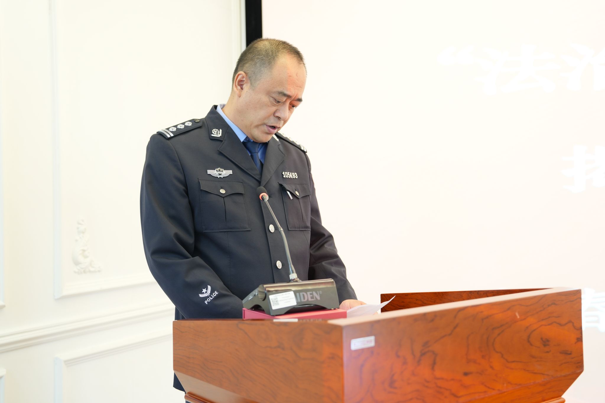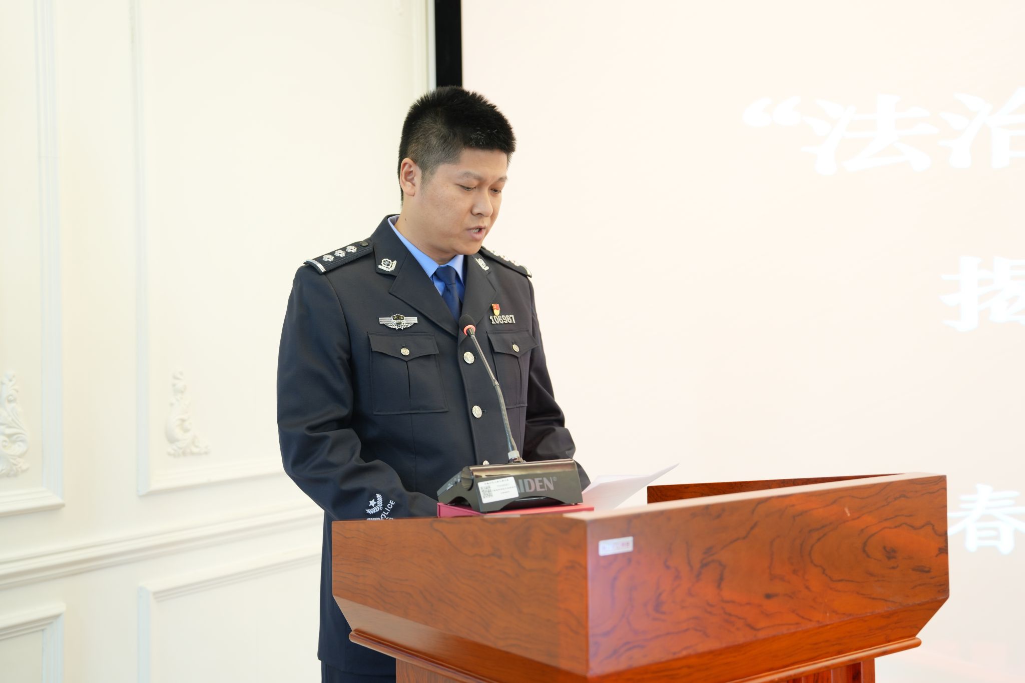 长春市公安局二道区分局金钱堡派出所所长张金磊代表法治辅导员发言。张金磊表示,将积极履职尽责,充分发挥法治辅导员职能作用,为师生提供更多更好的法治助力。