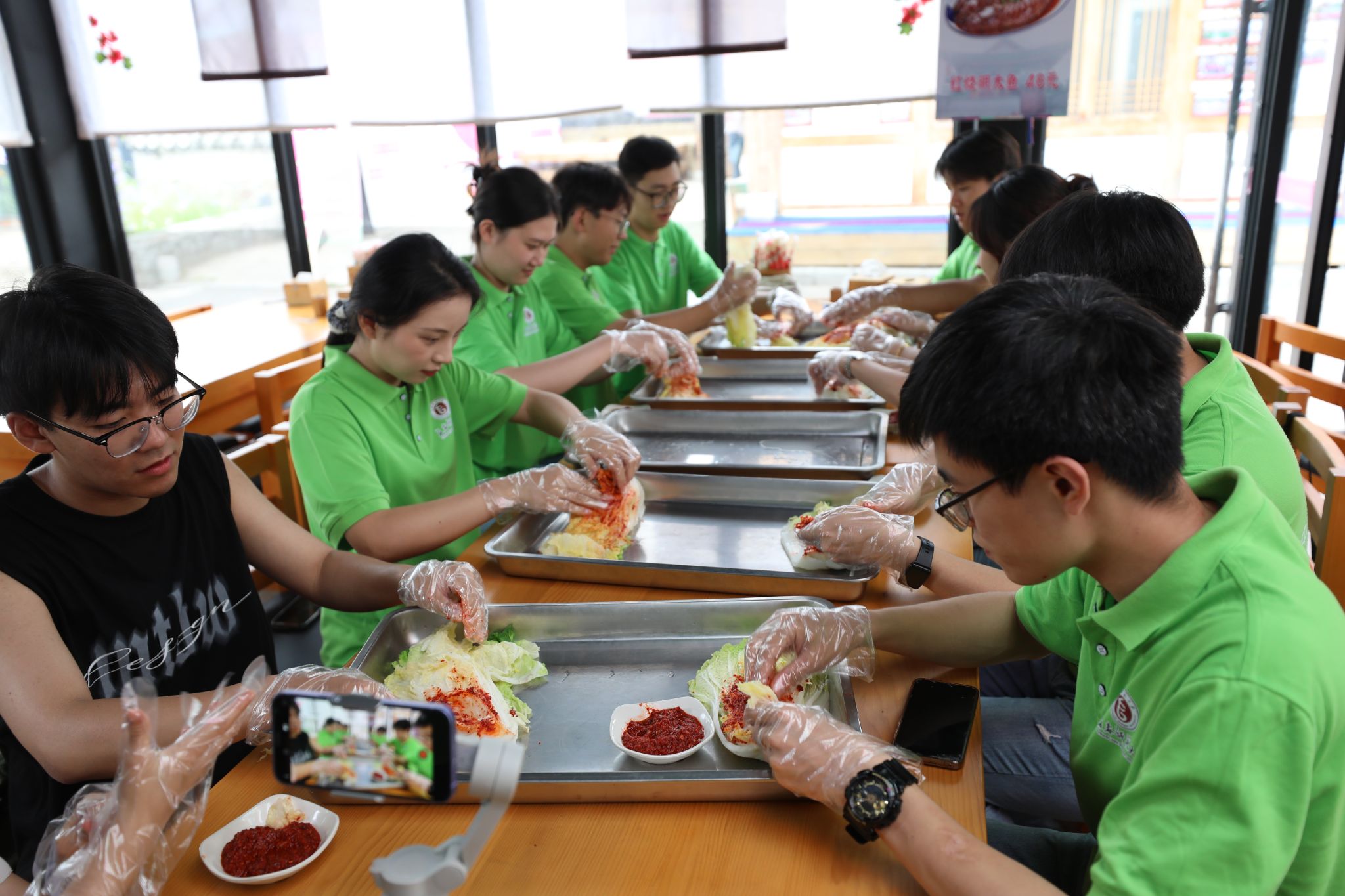 石榴花开,民族交融暖人心。实践团驻足百年朝鲜族老宅、穿梭在民族风格浓厚的金达莱民俗村,在地窖辣白菜厂参观和制作风味美食辣白菜,体验朝鲜族风土民俗。在北兴村四组农户的大院里,实践团队“送文艺到乡村”与当地村民共聚一堂,用歌声与舞蹈架起民族文化交流的桥梁。北兴村还特别组织了“强国复兴有我·光影聚力”主题放映活动,让实践团与北兴村通过光影的连接更加紧密。在全国爱国主义教育基地“汗王山城遗址文化展览室”,实践团跟随着三合镇宣传委员孙健的一路讲解,充分领略了满族文化,有效增强爱国主义意识、巩固民族团结成果。