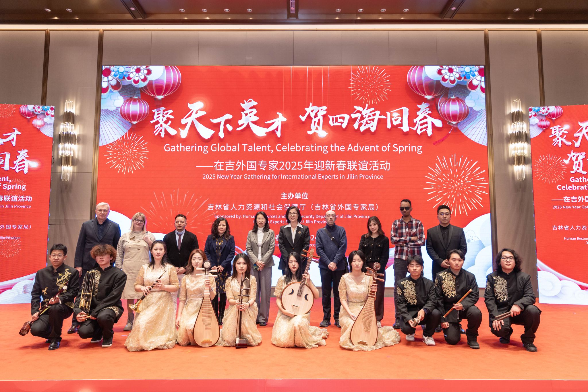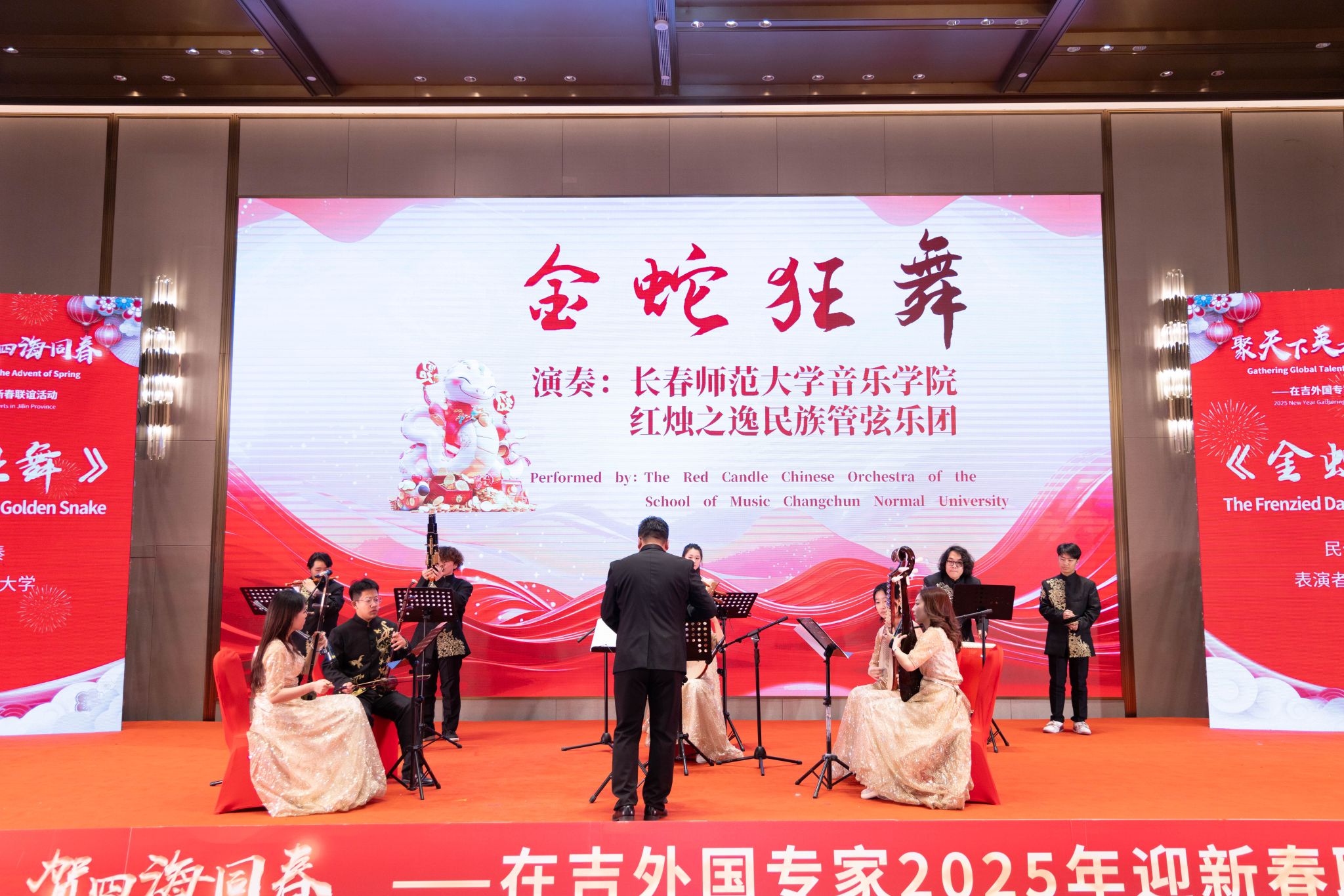 本次新春联谊会以“聚天下英才,贺四海同春”为主题,我校9名外国专家受邀参加联谊活动,音乐学院“红烛之逸”民族管弦乐团,受邀在活动中演奏民族音乐《金蛇狂舞》;外国语学院法国籍教师马天宇献唱中文歌曲《暗香》。吉林省教育厅、吉林省人民对外友好协会、吉林省公安厅出入境管理局等单位代表,以及来自不同国家地区的200多位在吉外国专家参加活动。