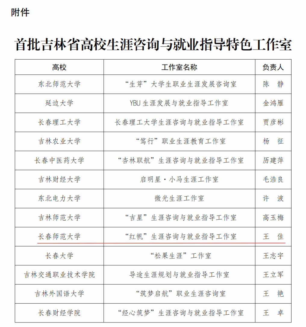 近日,吉林省教育厅公布了《关于加强吉林省高校生涯咨询与就业指导工作室建设的通知》,经高校申报、省级评审,确定我校“红帆”生涯咨询与就业指导工作室为首批吉林省高校生涯咨询与就业指导特色工作室。